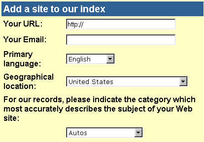 Click here to add your site to the Excite Search Index only. This option is still free of charge but comes with no guarantees. For more information, please read Getting Listed on Excite.